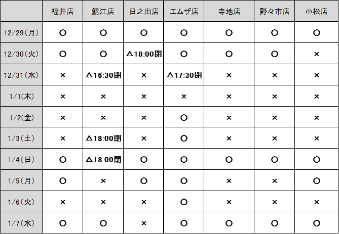 ■ 記号の見方〇:通常営業/振替営業△:短縮営業✕:休業/臨時休業
